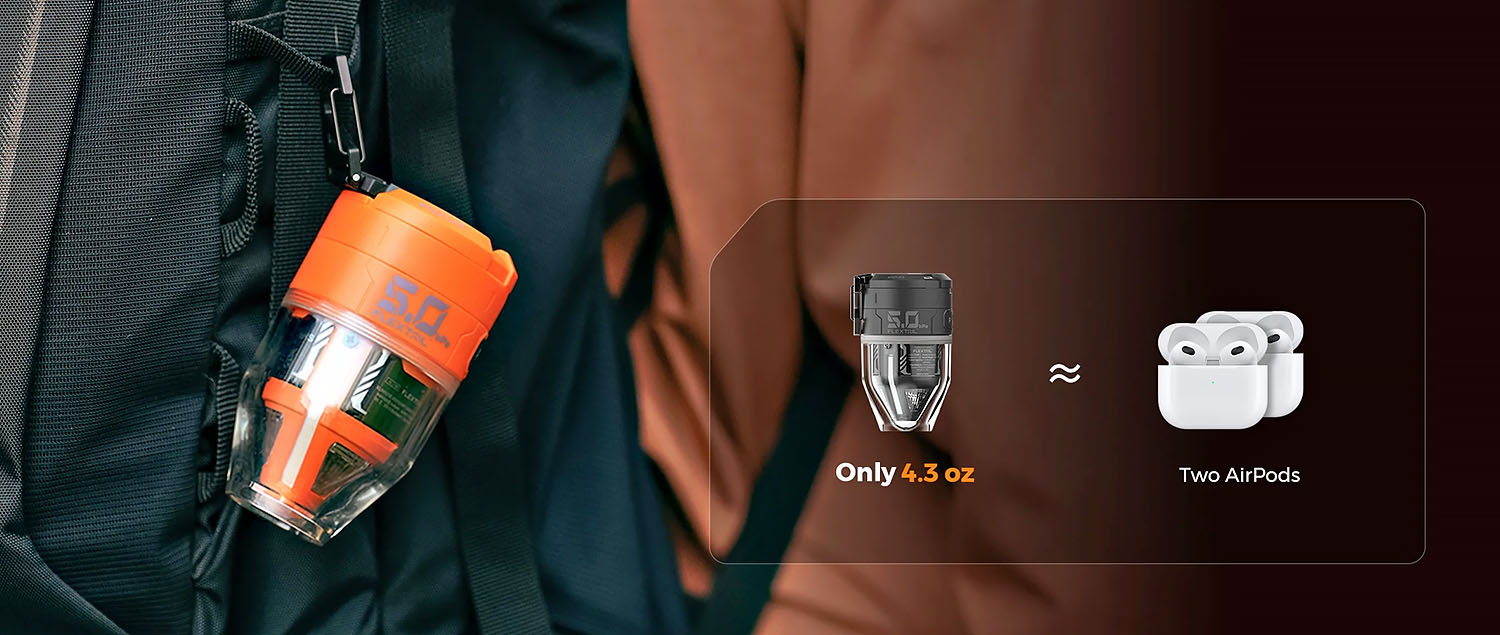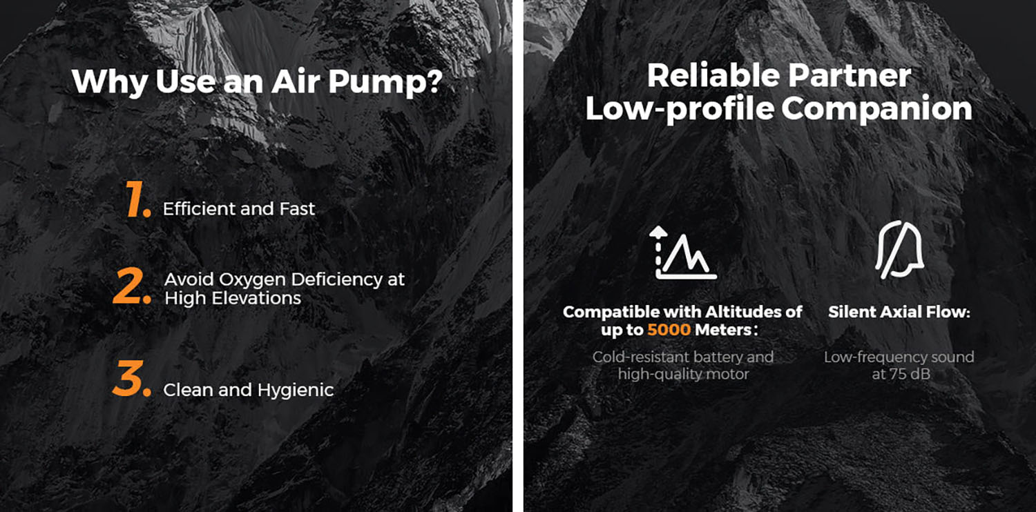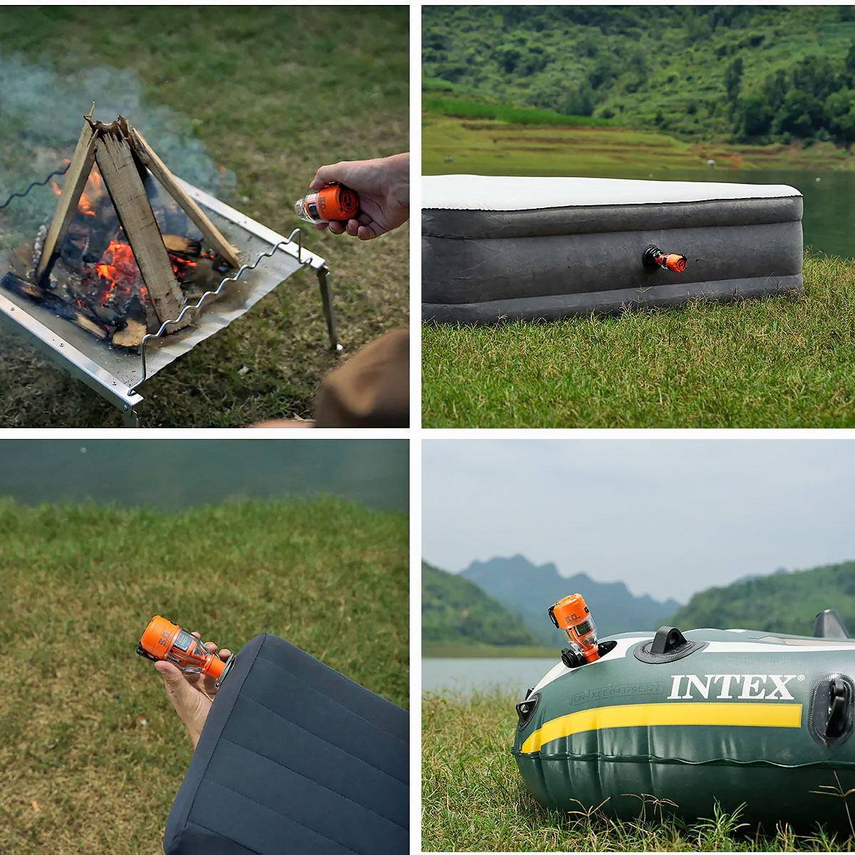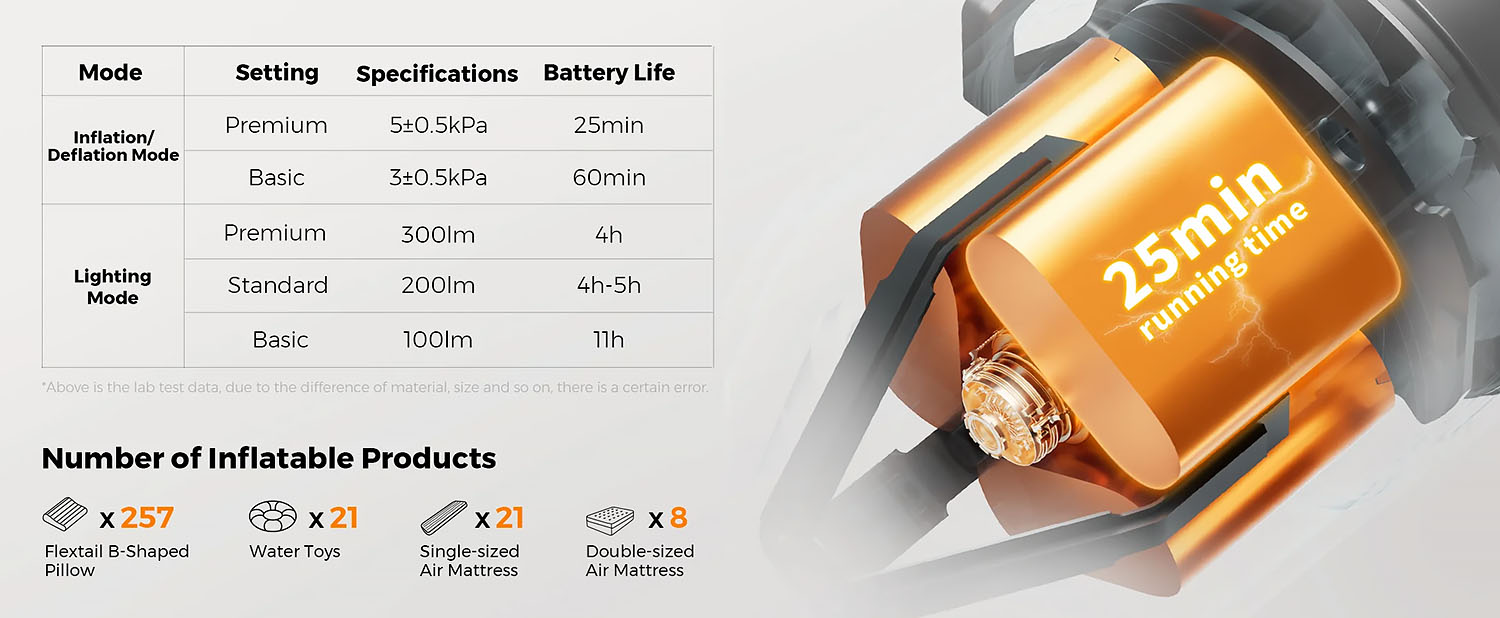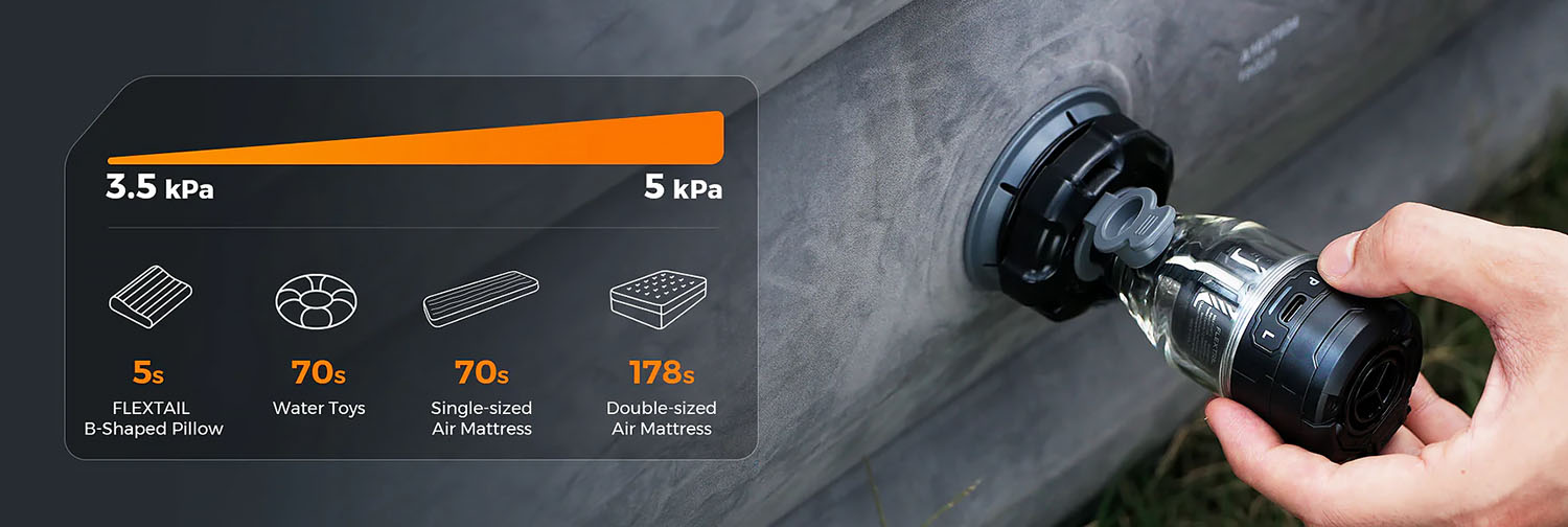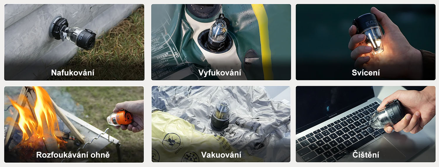 Rychlá designová akumulátorová pumpa 3 v 1 s malými rozměry a vysokým průtokem vzduchu. Navíc funkce svítilny a vakuové pumpy. Váha 122 g.