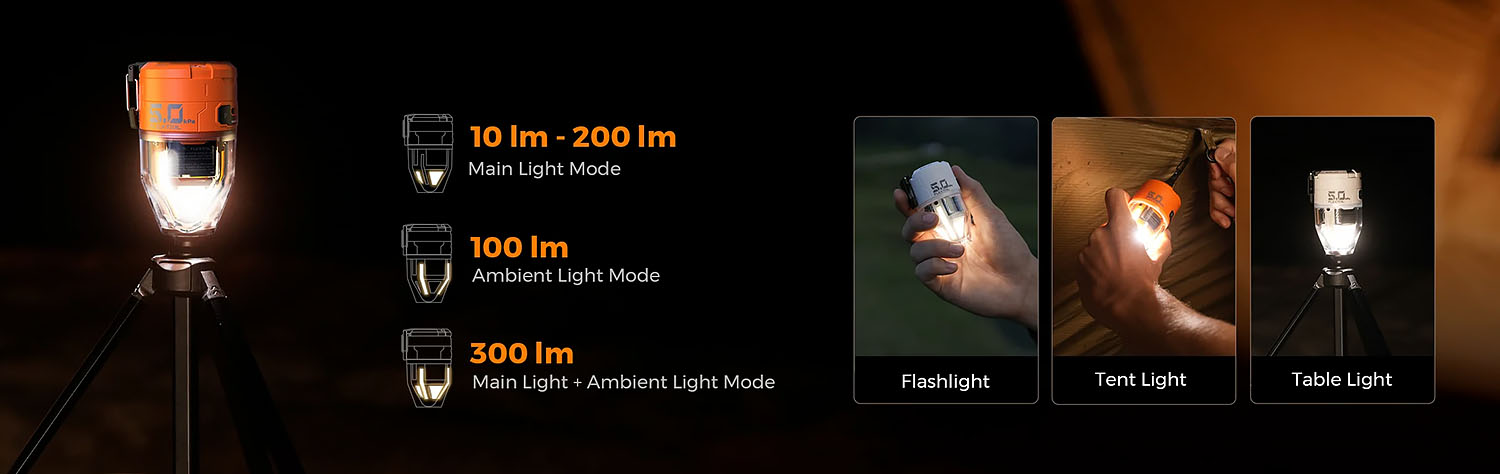 | Svítivost kempinkového světla | 10-100 / 200 / 300 lm |