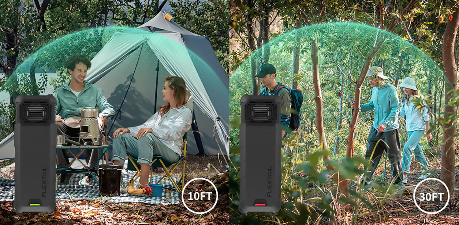 Přenosný bateriový odpuzovač komárů 2v1. Kombinuje odpuzovač komárů a powerbanku. Odolnost proti vodě a mechanickému poškození IP65. Váha 200 g.