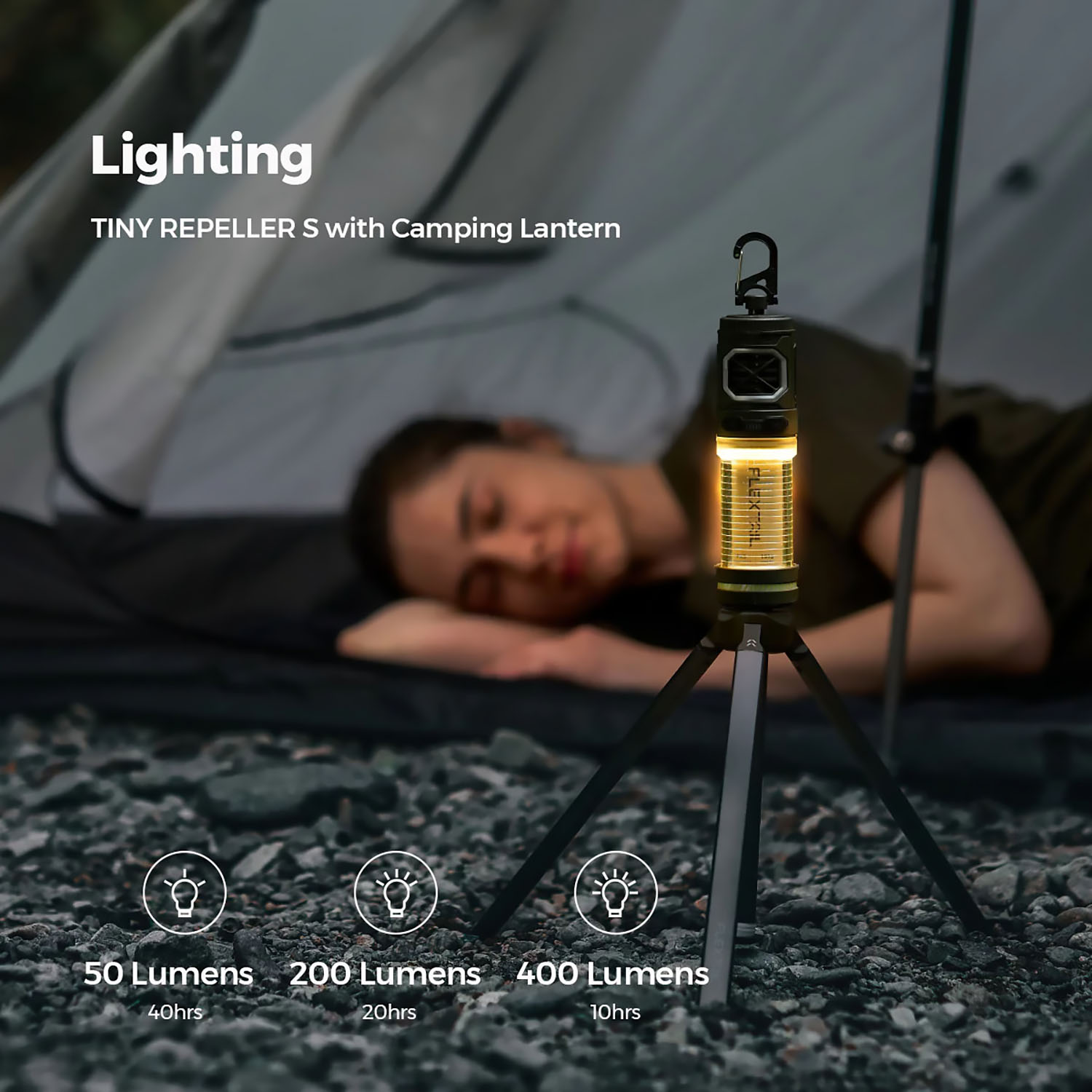 Přenosný a kompaktní bateriový odpuzovač komárů 2v1. Kombinuje odpuzovač komárů a svítilnu. Odolnost proti vodě IPX5. Váha 151 g.