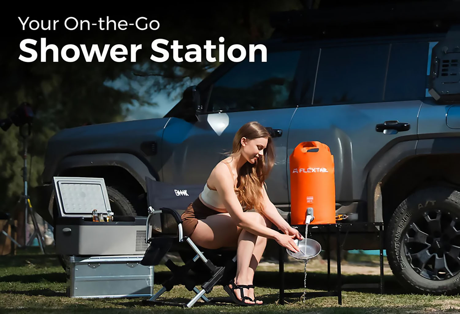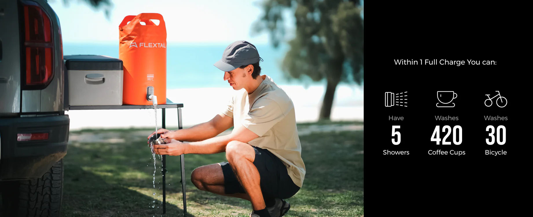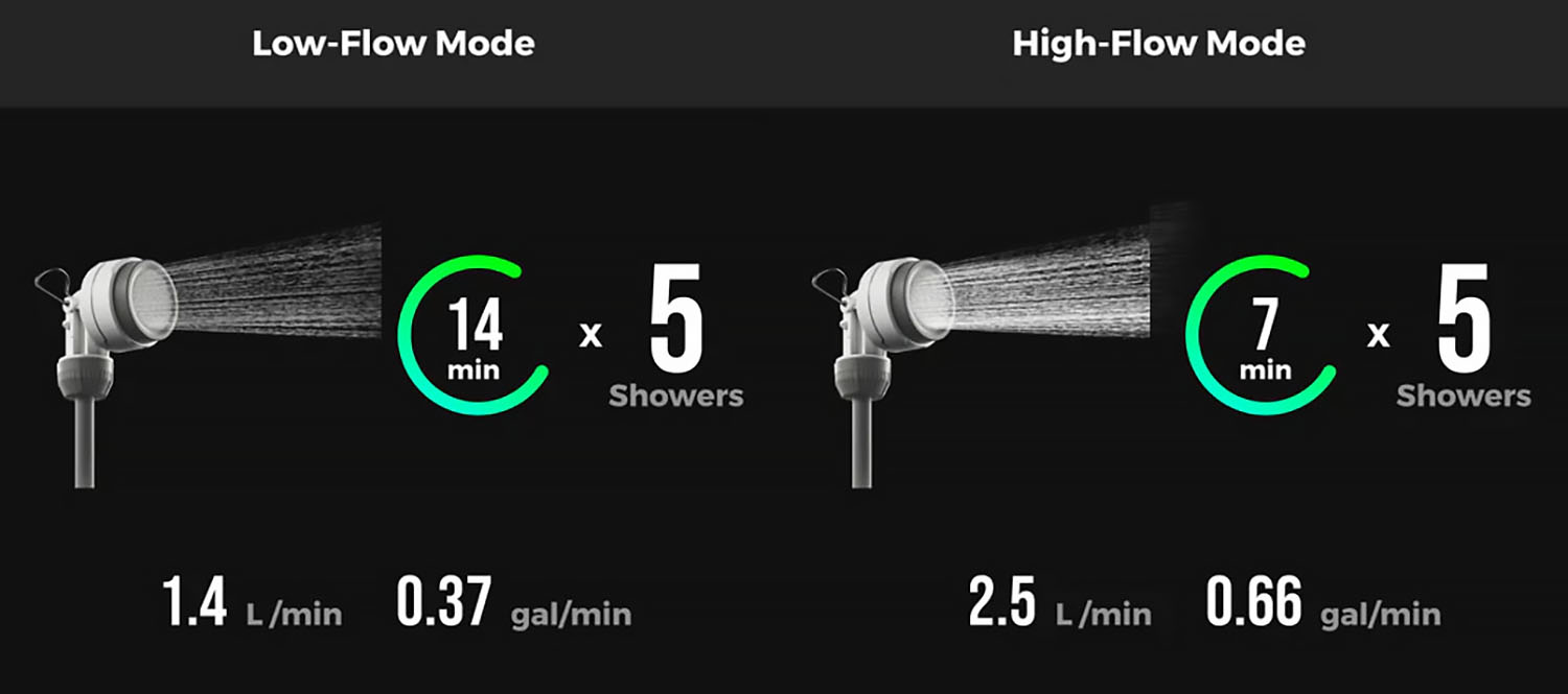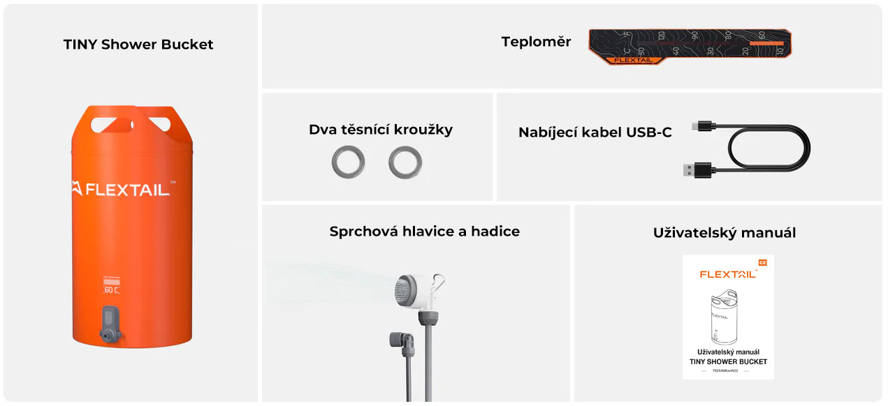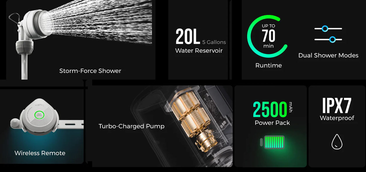 Miniaturní outdoorová přenosná bateriová sprcha s nádrží 20 l. Žádné další díly. Stačí jen naplnit vodou a stisknout. Vhodné pro výlety autem, kempování v přírodě, pobyt na pláži, … Dopřejte si rychlé a silné osprchování kdekoli.